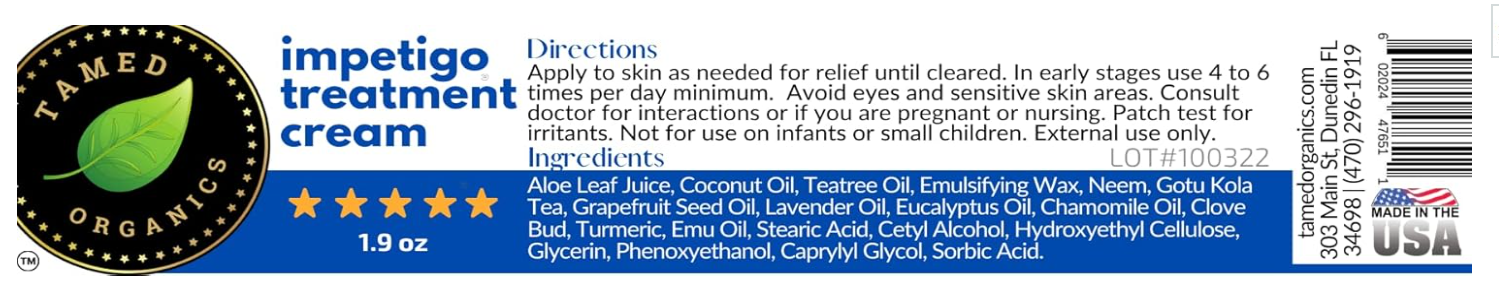 Anti-Scarring Formulation: Because of the anti-itch properties and also the healing properties in our natural formula, Tamed Organics Impetigo Cream will help minimize the potential scarring effects from impetigo and is safe for use long after the infection has dried up, as sores are healing.